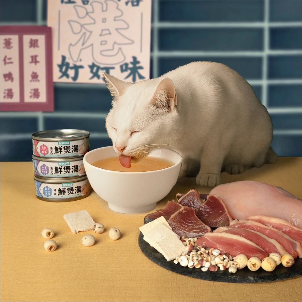 鮮煲湯以高比例的湯汁為主,適合作為日常補水的輕盈選擇;若貓咪喜歡咬咬、增添飽足感,可以選擇肉含量較高的其他副食罐喔!