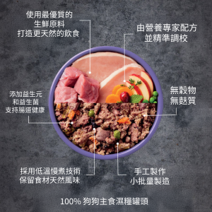 果蔬組成:(紅莓、藍莓、桑葚、山桑子、越橘、番莞茜、薄荷、牛至、鼠尾草、馬鬱蘭、百里香、洋甘菊、玫瑰果、絲蘭、茴香、蕁麻、萬壽菊、胡蘆巴和肉桂,2.54%)、甜薯(1%)、胡蘿蔔(1%)、苜蓿、豌豆(1%)、番茄(0.5%)、木薯、蘋果(0.5%)、梨(0.5%)、鷹嘴豆、橙(0.5%)、礦物質、葡萄糖胺(1000mg/kg)、軟骨素(1000mg/kg)、菊苣(100mg/kg)、海藻、螺旋藻