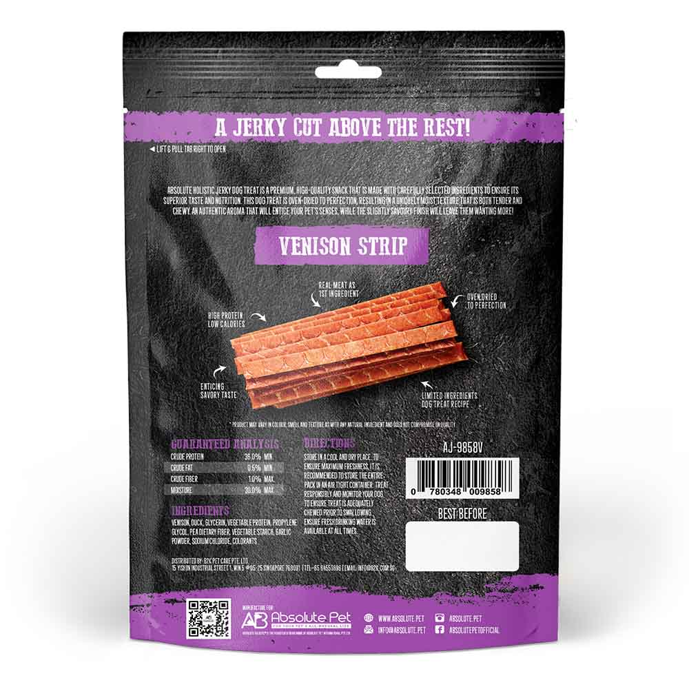 Absolute Holistic Venison Jerky Loin Strip – the ultimate grain-free treat for chicken sensitive dogs. Made with tender, flame-grilled venison and wrapped in pollock, this snack is irresistible to dogs. No chicken or artificial ingredients included.