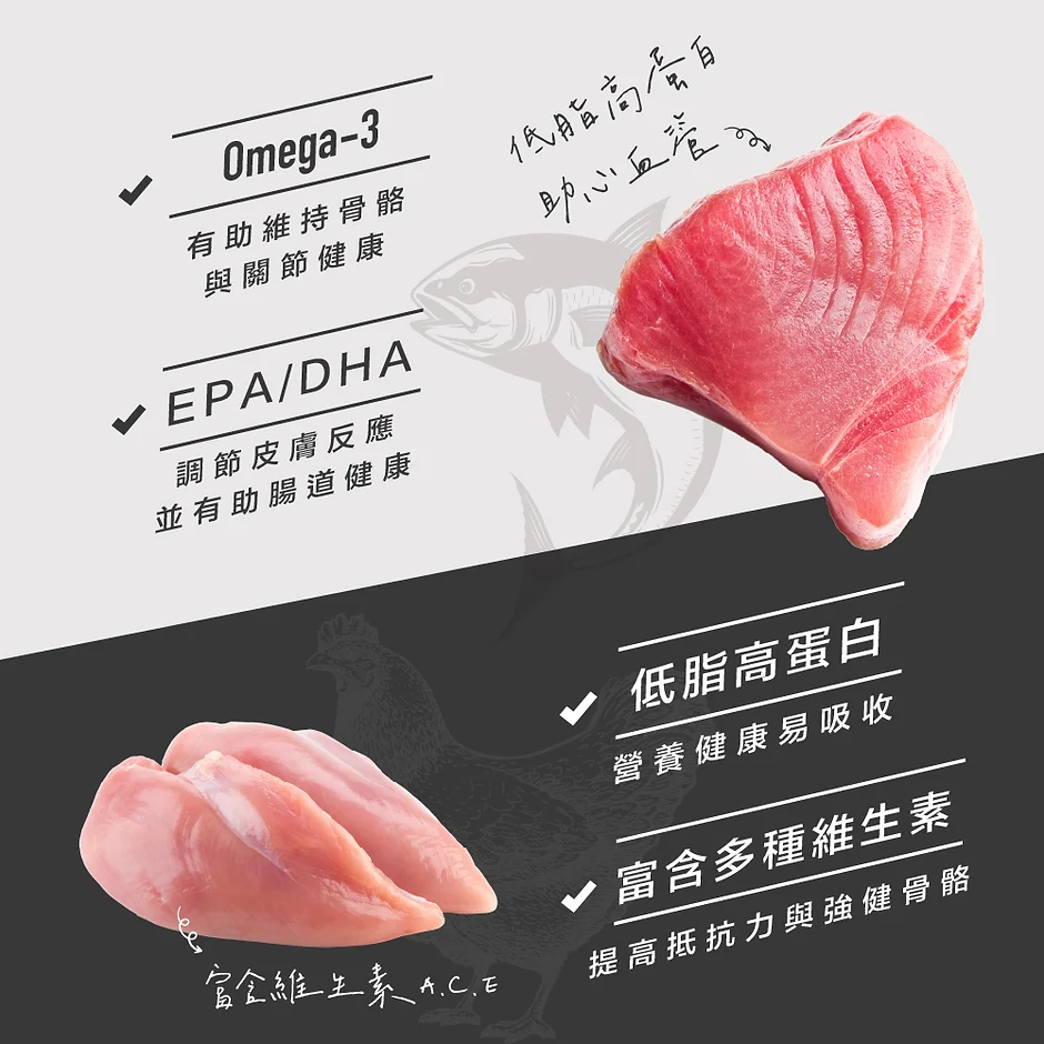 完全無穀 + 低脂肪 + 富含維生素 + 人類食用級天然食材