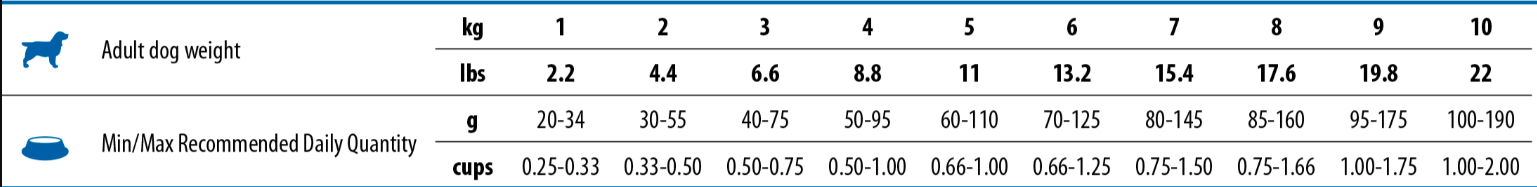 粗蛋白27%、粗脂肪16%、粗纖維2.9%、水分9%、粗灰分7.9%、鈣 0.9%、磷 0.8%、Omega-6 1.6%、Omega-3 2%、DHA 0.85%、EPA 0.55%、葡萄糖胺 1000mg/kg、硫酸軟骨素 700mg/kg
