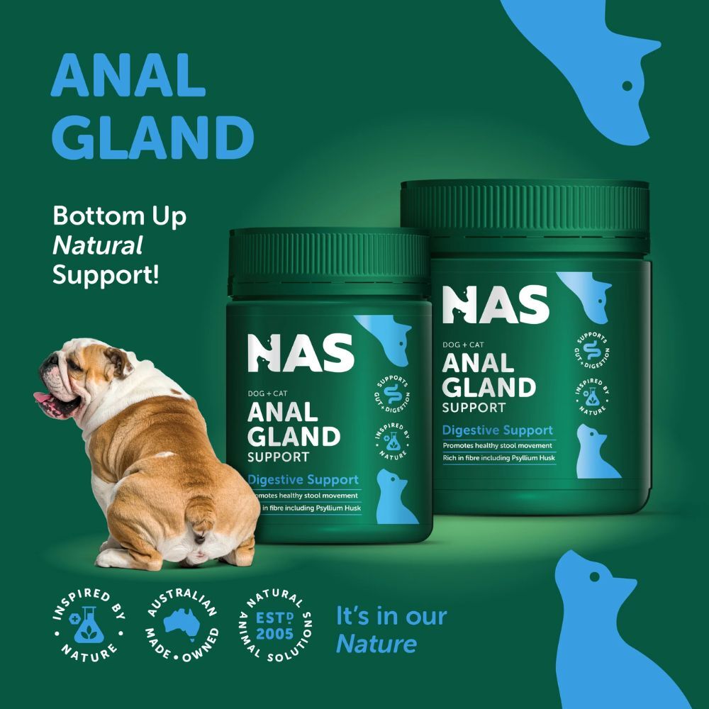 NAS Anal Gland Support 是天然高纖維補充劑,促進健康肛門腺功能,形成良好形狀糞便以自然表達,支持消化平衡、腸道健康及犬貓日常舒適—自然減少拖臀及不適。