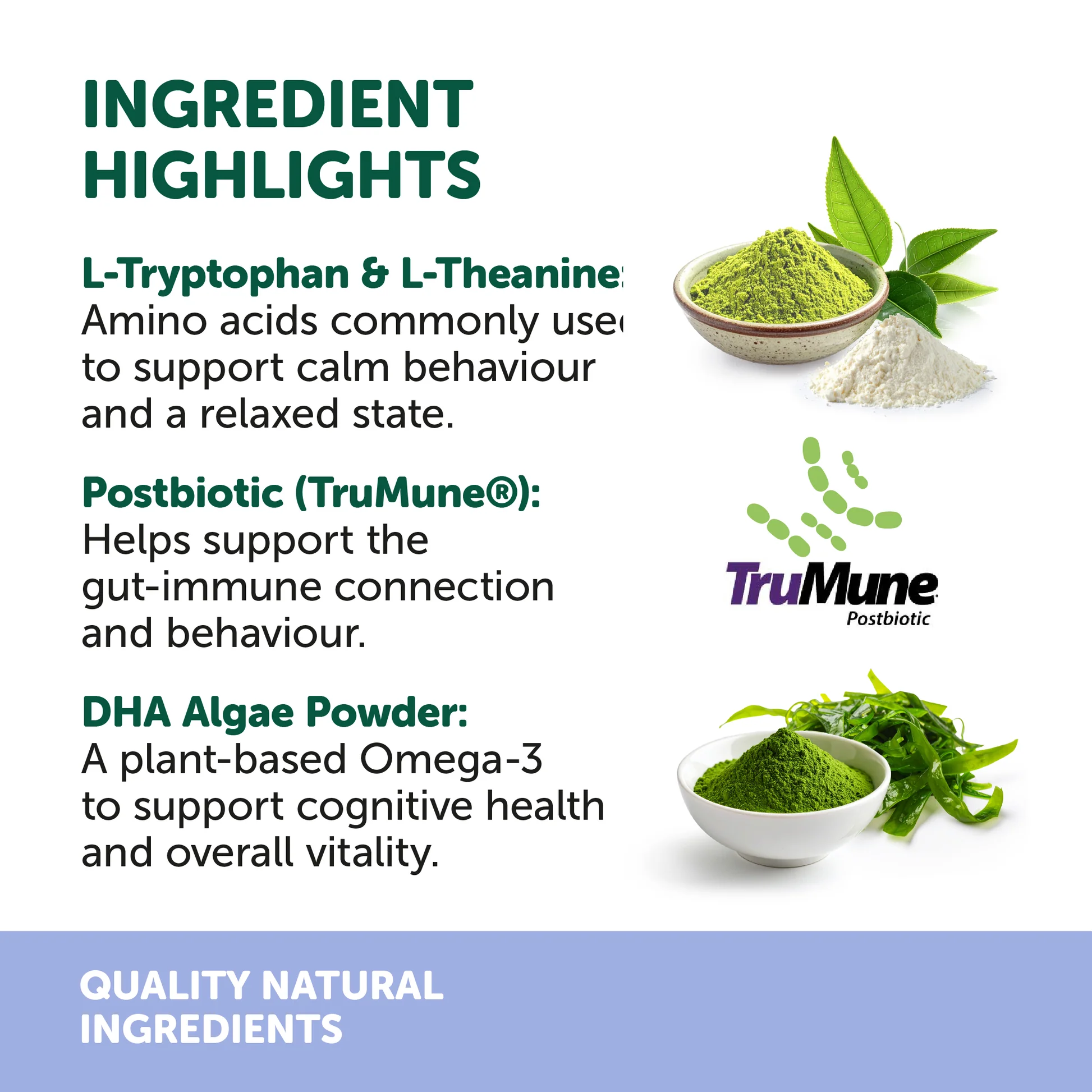 活性成分:後生元(Trumune®)、L-色氨酸、L-茶氨酸、纈草根、洋甘菊、南非醉茄根。
