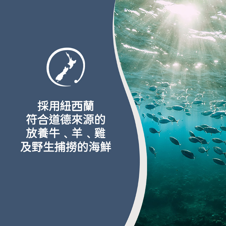 • 採用紐西蘭符合道德來源的放養牛及野生捕撈的海鮮